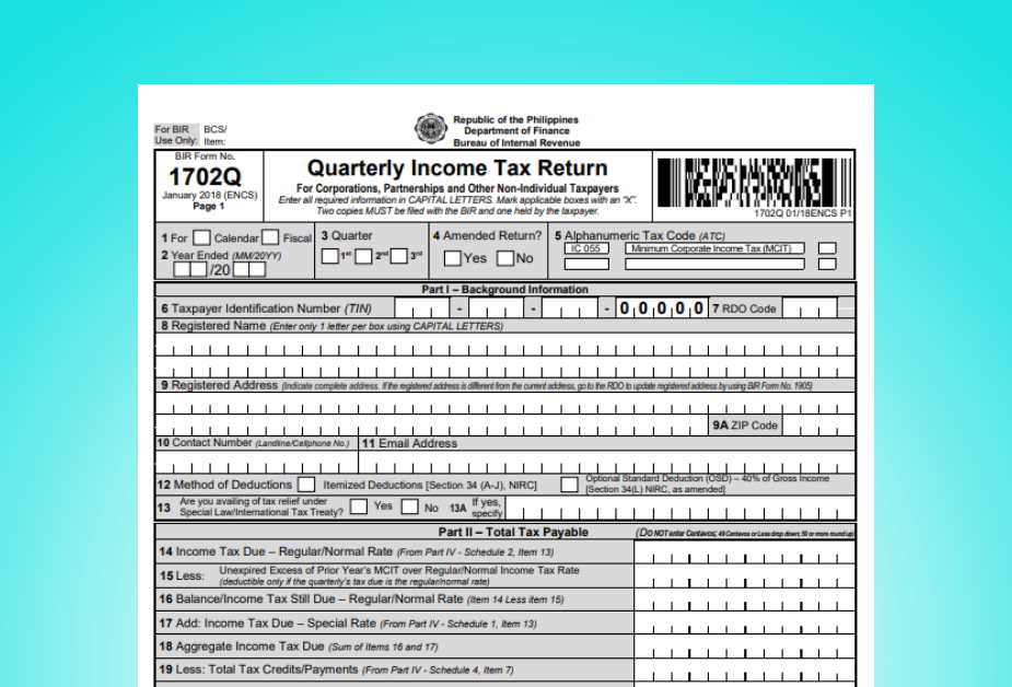 BIR Form 1702Q is the Quarterly Income Tax Return for Corporations, Partnerships, and Other Non-Individual Taxpayers. It’s used to declare income, compute tax due, and pay income taxes on a quarterly basis (before the annual return).