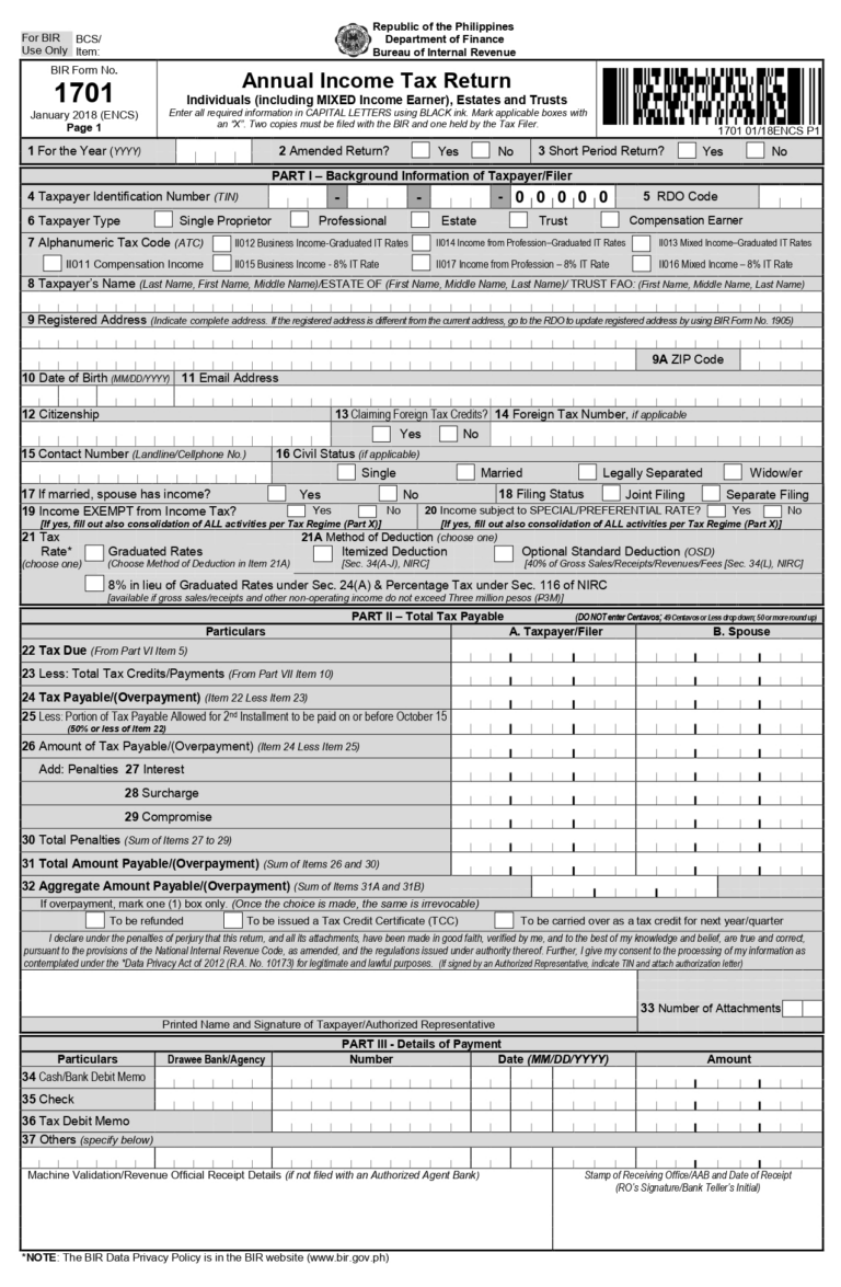BIR Form 1701, or the Annual Income Tax Return for Individuals, is the tax form used to report total income from the previous calendar year. It is designed for taxpayers who use the itemized deduction method or those who earn income from multiple sources.