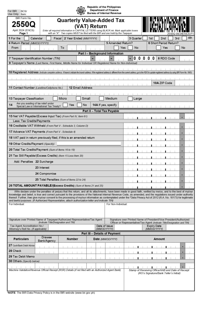 BIR Form 2550Q, or the Quarterly Value-Added Tax Return, is a tax form used by VAT-registered individuals or businesses to report their total sales and purchases every quarter. It allows taxpayers to calculate the Output VAT (tax on sales) and deduct the Input VAT (tax paid on purchases) to determine the total VAT payable to or refundable from the government.