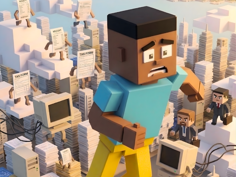 Carlo, a small business owner, is seconds away from missing his tax filing. Everything is coming at him all at once. Stacks of papers, receipts swirling, and towering tax obstacles blocking his path.